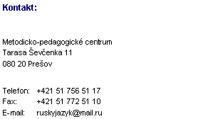 V dňoch 14.- 19. augusta 2006 sa uskutoční Letný kurz ruského jazyka ktorý organizujú Metodicko-pedagogické centrá v Prešove a Bratislave Miesto konania kurzu— Stará Ľubovňa (hotel Komeko Agrotour). Obsahové zameranie kurzu: nové formy a metódy vyučovania ruského jazyka, praktické cvičenia a konverzácia v ruskom jazyku, základy tlmočenia a prekladov, besedy, Ubytovanie: jedno-, dvoj– alebo trojposteľové izby s príslušenstvom, vybavené televízorom s možnosťou sledovania ruských programov. V hoteli je bazén, sauna, bar. Vzdialenosť od autobusovej a železničnej stanice asi 5 minút peši, centrum mesta—15 minút, hrad—40 minút. Cena ubytovania: 250,- Sk / noc Predbežný záujem hláste na adrese ruskyjazyk@mail.ru |